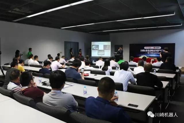 川崎机器人(天津)有限公司董事长兼总经理磯部正史、川崎机器人(天津)有限公司副总经理金烨、肯倍全球销售总监大客户及OEM经理Mikko Väisänen、肯倍(中国)董事、总经理耿烽、江苏大德重工股份有限公司总经理李明杰、天津华日自动化系统工程有限公司副总经理刘月等领导以及现场合 作伙伴、媒体共同参与,见证川崎与肯倍战略合作的震撼时刻,并揭开川崎新产品的“神秘面纱”。
